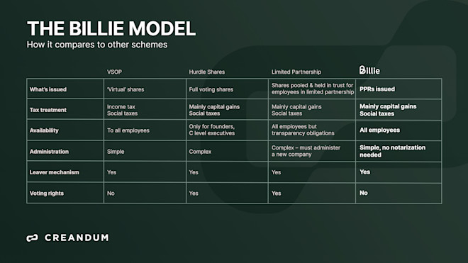 So, together with the law firm, V14, and tax consultants, FGS, they built their own model based on ‘Profit Participation Rights’ (PPRs, in German: Genussrechte). The model has been approved by the Berlin Financial Authorities and Billie will now transition from issuing VSOPs to ESOPs via PPRs.