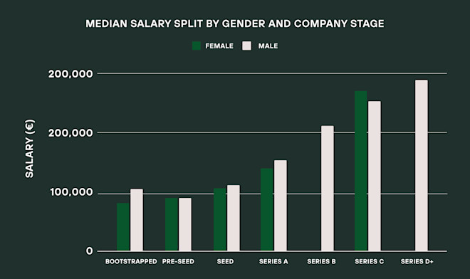 Across funding stages, the differential between male and female founders has nearly closed at Seed and Series A, with women earning within 3-5% of their male counterparts. At Series C, female founders' median pay (around €220,000) is even slightly higher than that of their male peers.