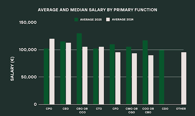 Again, this reflects the uneven nature of the current tech ecosystem. Later-stage US tech companies might be seeing — driven largely by mega AI and FinTech rounds — but seed and early-stage companies still faced cautious valuations and longer fundraising timelines. Founders who can skillfully navigate that landscape are being rewarded. Meanwhile, those who focus primarily on building, as Chief Product Officers, and last year's highest earners, are now earning the least – a median of around €85,000.