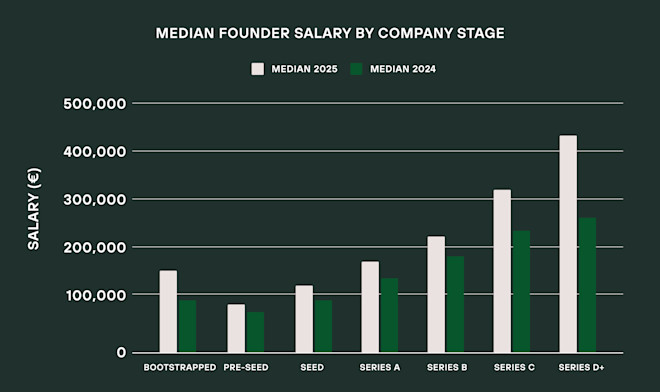 There was also a 23% decline in median founder salary from the bootstrapped stage to Pre-Seed, noting that while bootstrapped companies may not have had external institutional investment, this doesn't necessarily mean they are cash-poor; often, quite the opposite. Some will be highly profitable or self-funded, so it's not a given that they will eventually raise a Pre-Seed round and may even skip to Series A, which may explain why the salaries of bootstrapped founders have risen considerably from last year, with median salaries (€77,500) approaching those of Seed-stage founders (€89,000).