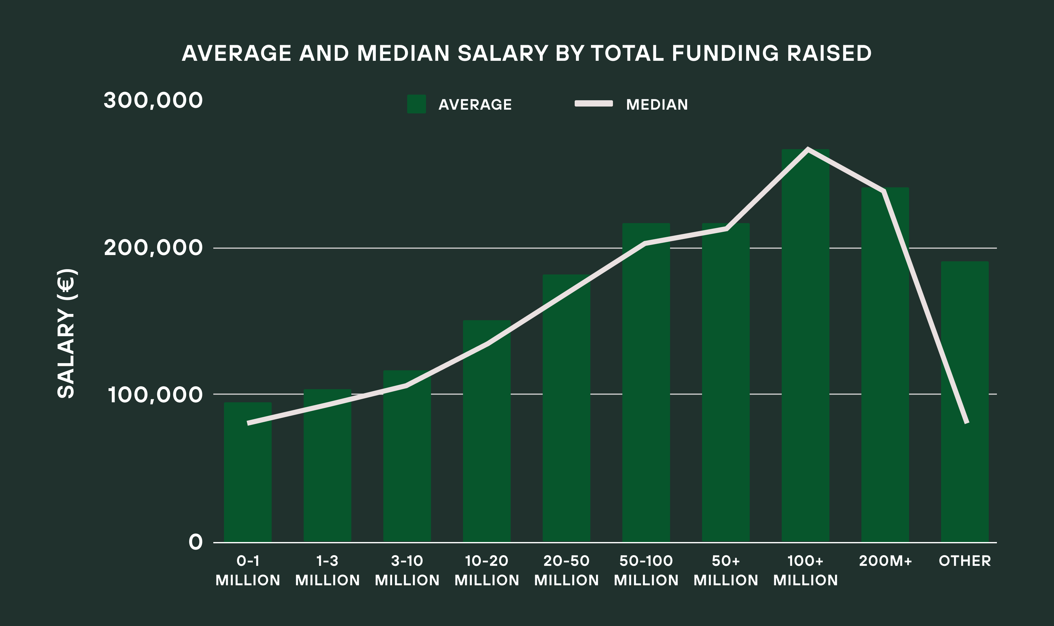 Salaries are increasing steadily with stage: Median salaries peak at Series C at around €225,000, and average salaries peak at Series D+ at around €246,000.