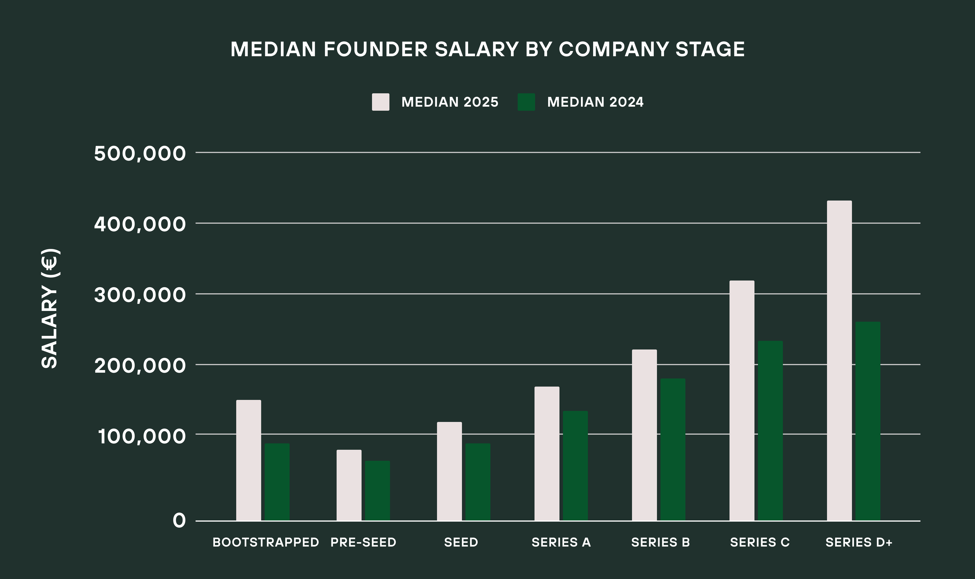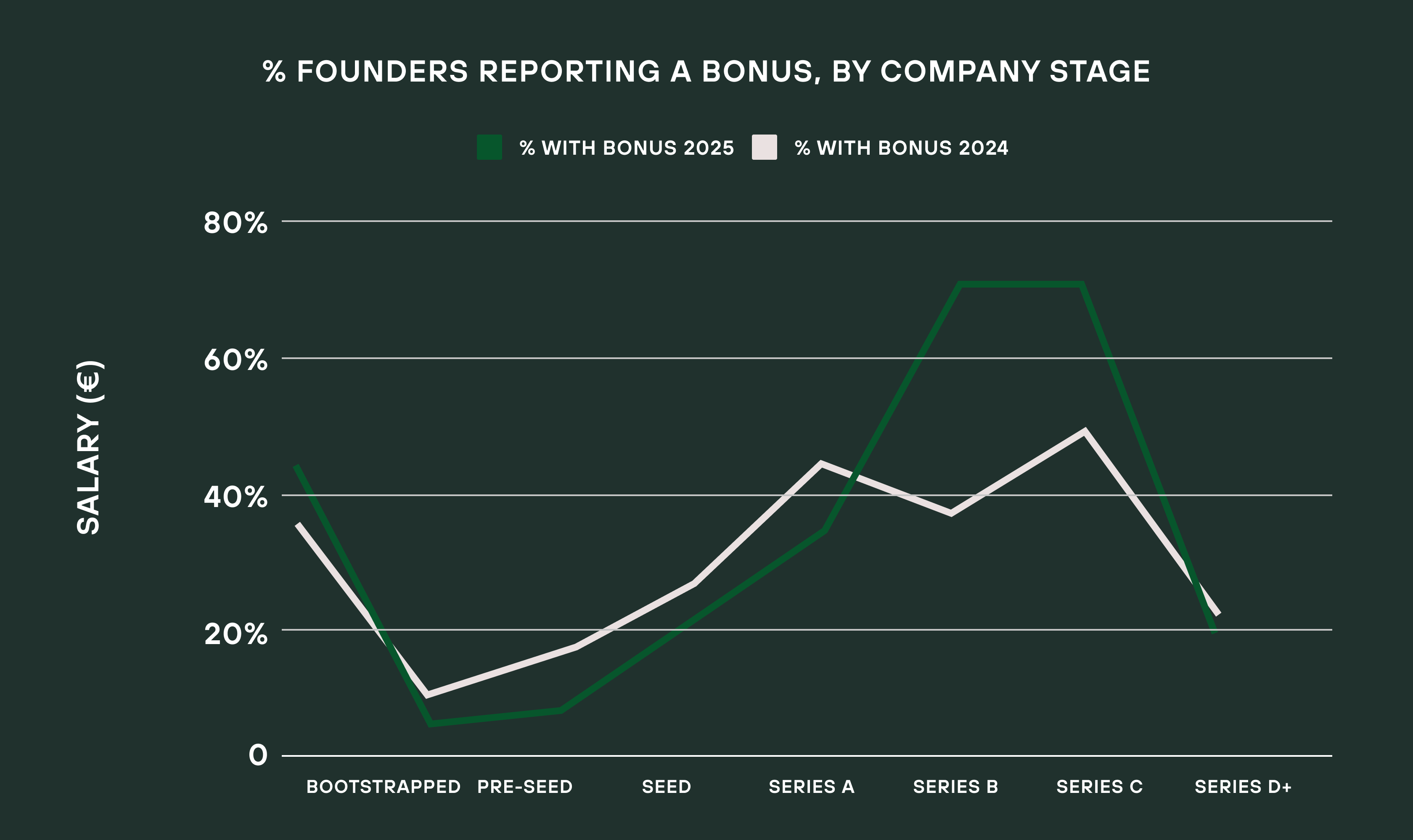 Series A and B rounds were up 10% QoQ and YoY as of Q3 2025, , and so it's no surprise to see healthy median salary growth from last year. Series A and B founders now take home a median salary of €154,464 and €199,450, respectively. It's around this time that bonuses become both commonplace and sizable, reflecting a shift toward structured compensation as companies scale, peaking at Series C, when around 70% of founders received bonuses.