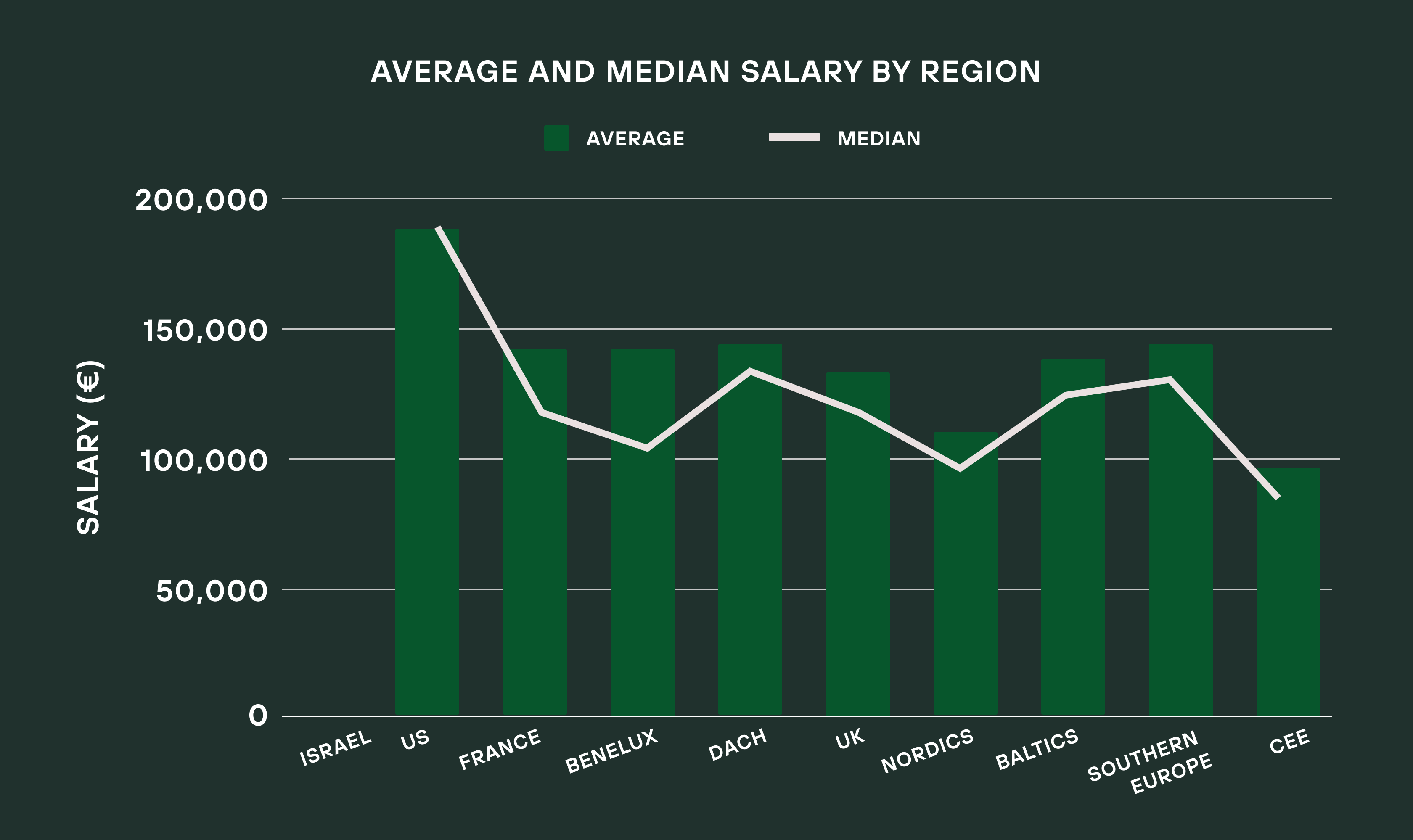 France and DACH follow closely behind, with medians around €100-115K, continuing to outpace the UK (€100K) for a second consecutive year.